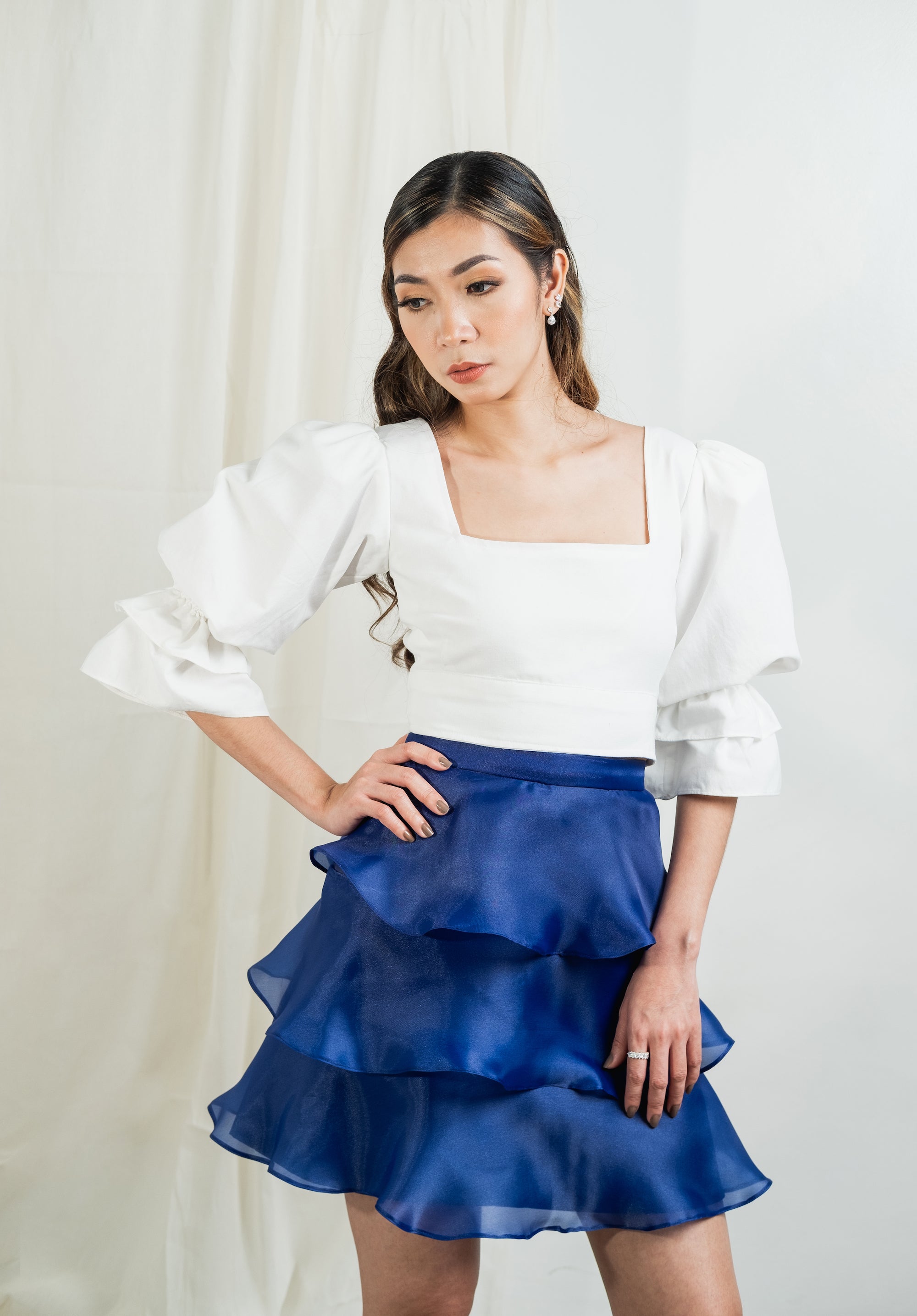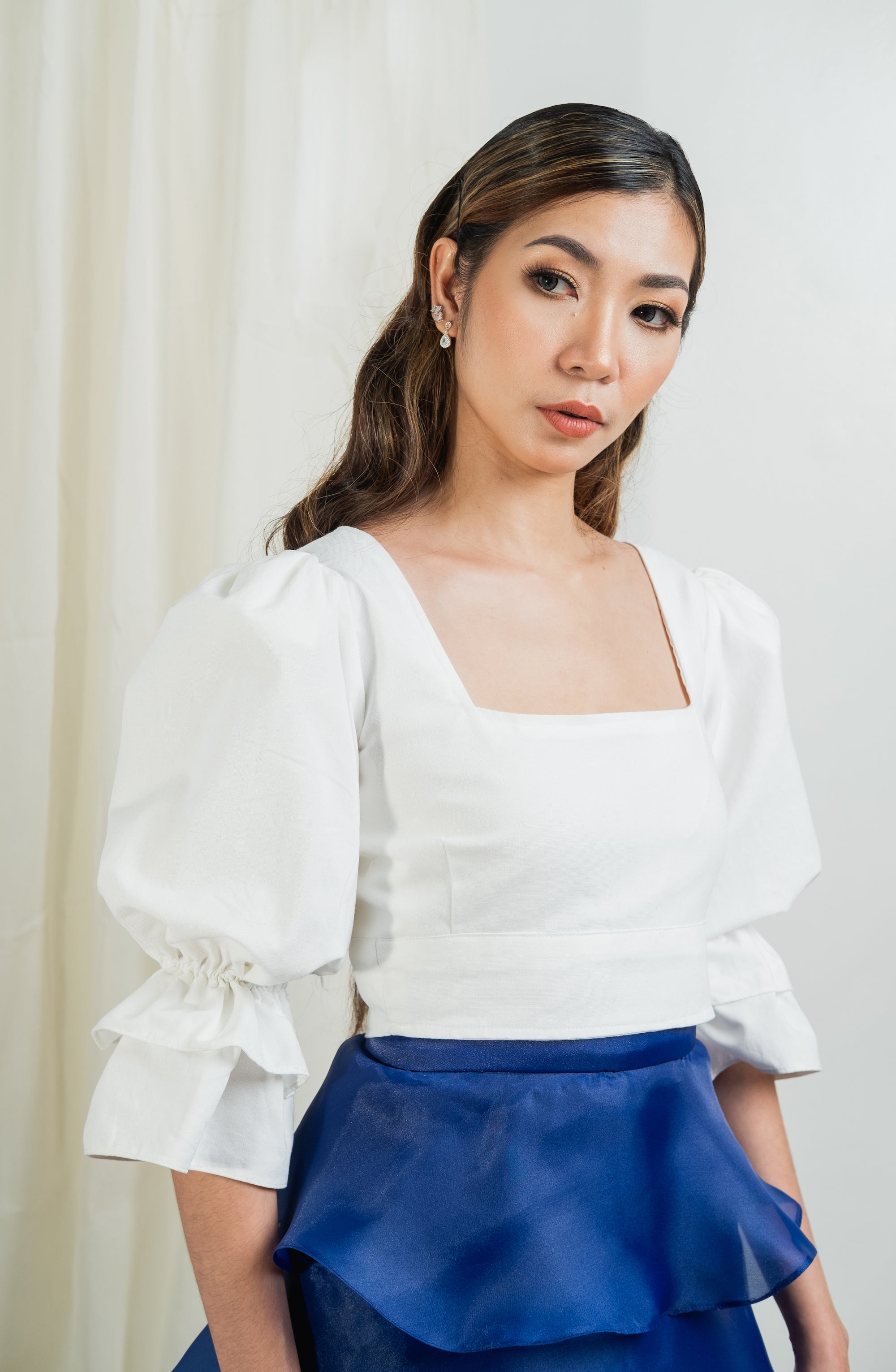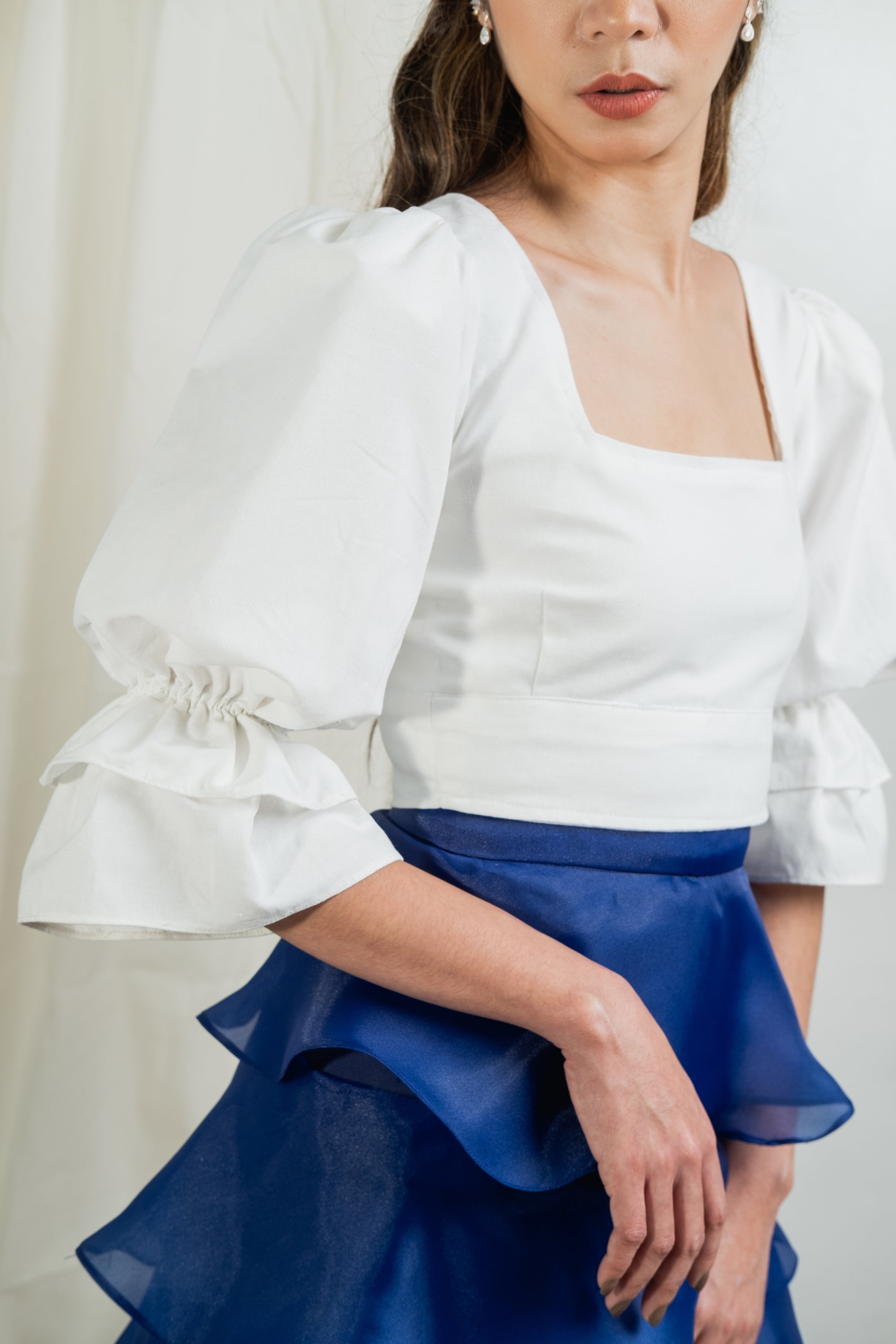 Square neck, puffed and gathered sleeve crop top with button closure that goes well with almost everything. From jeans to formal trousers and skirt. Made with fully lined linen material.