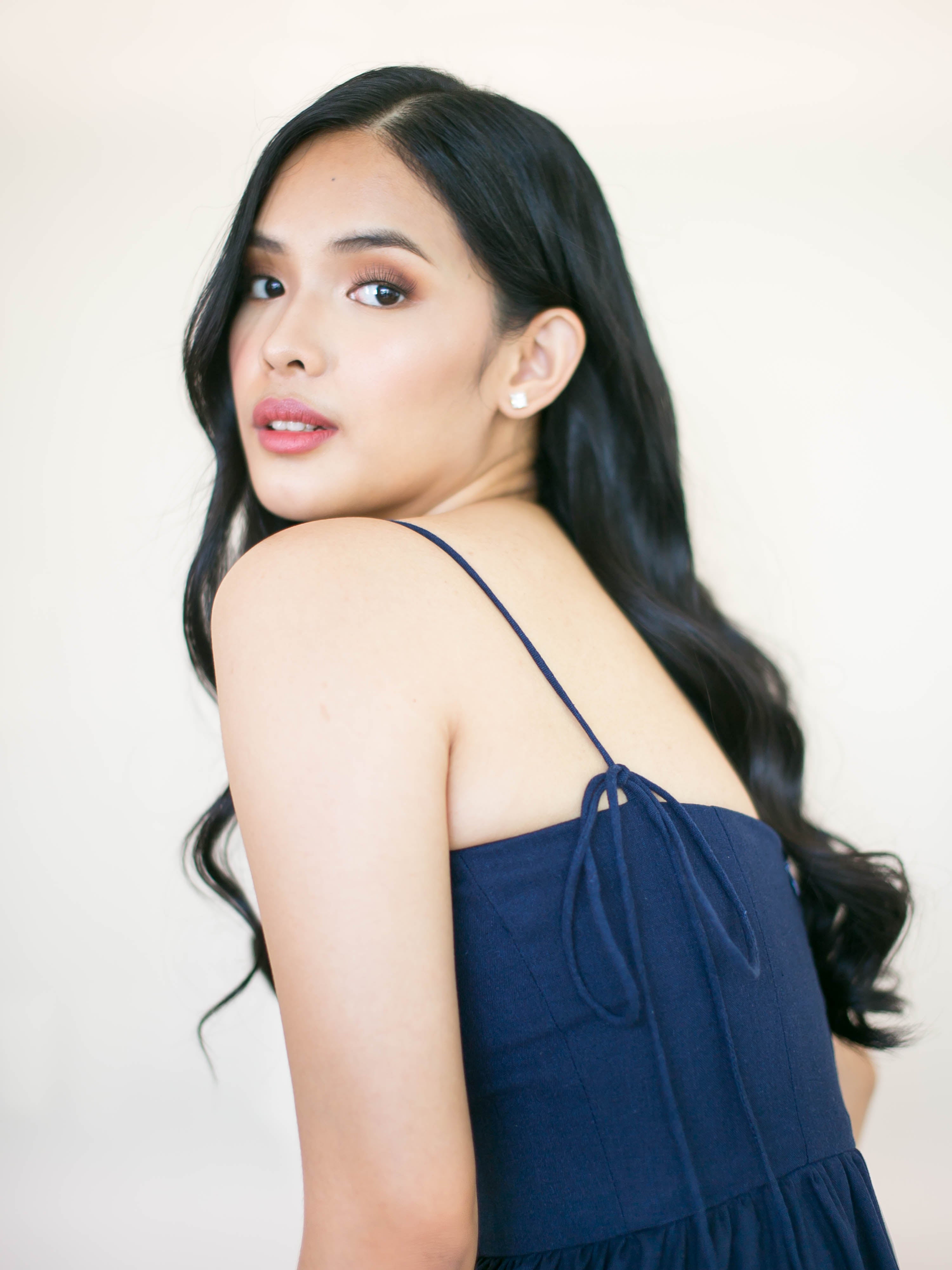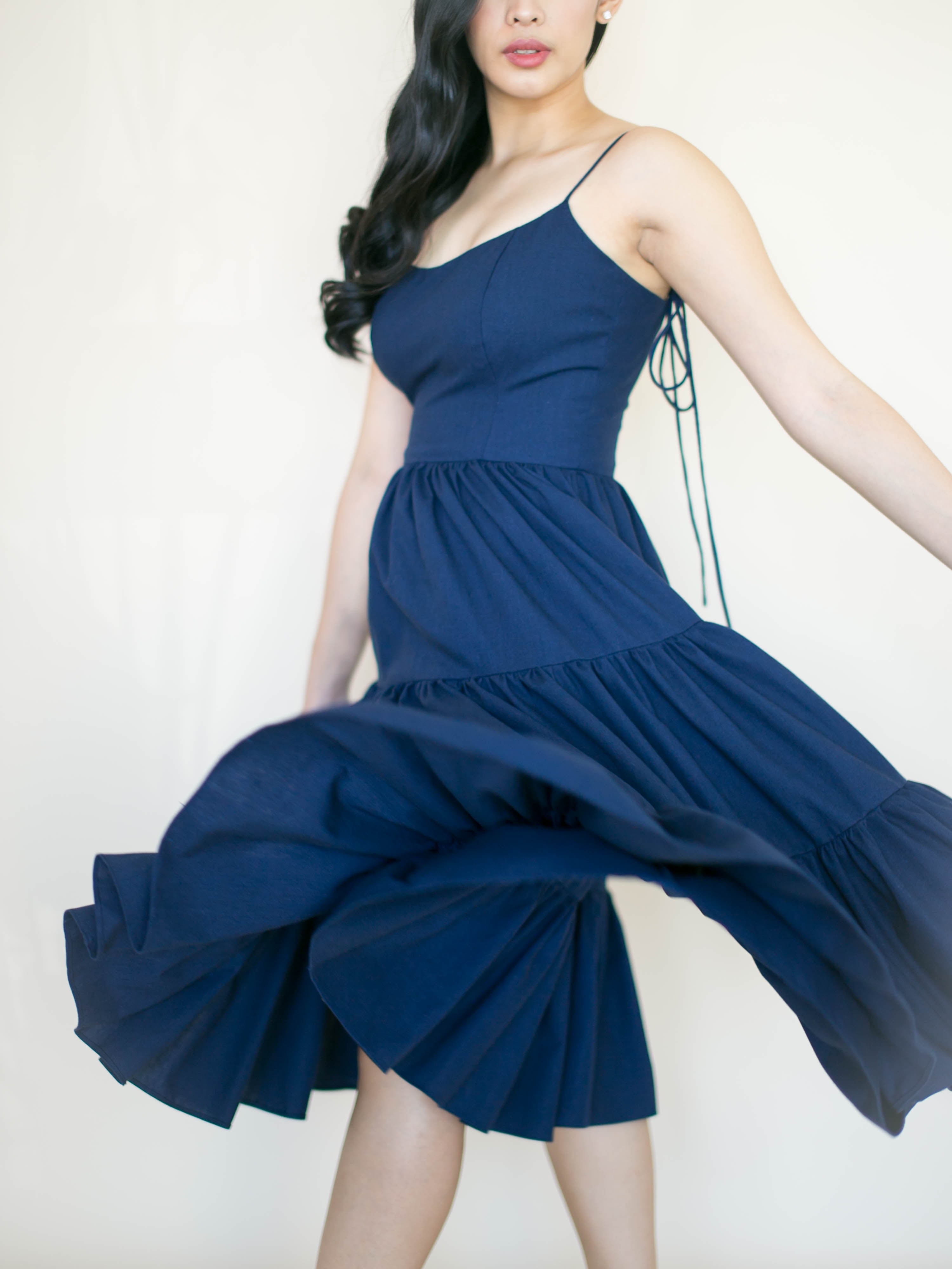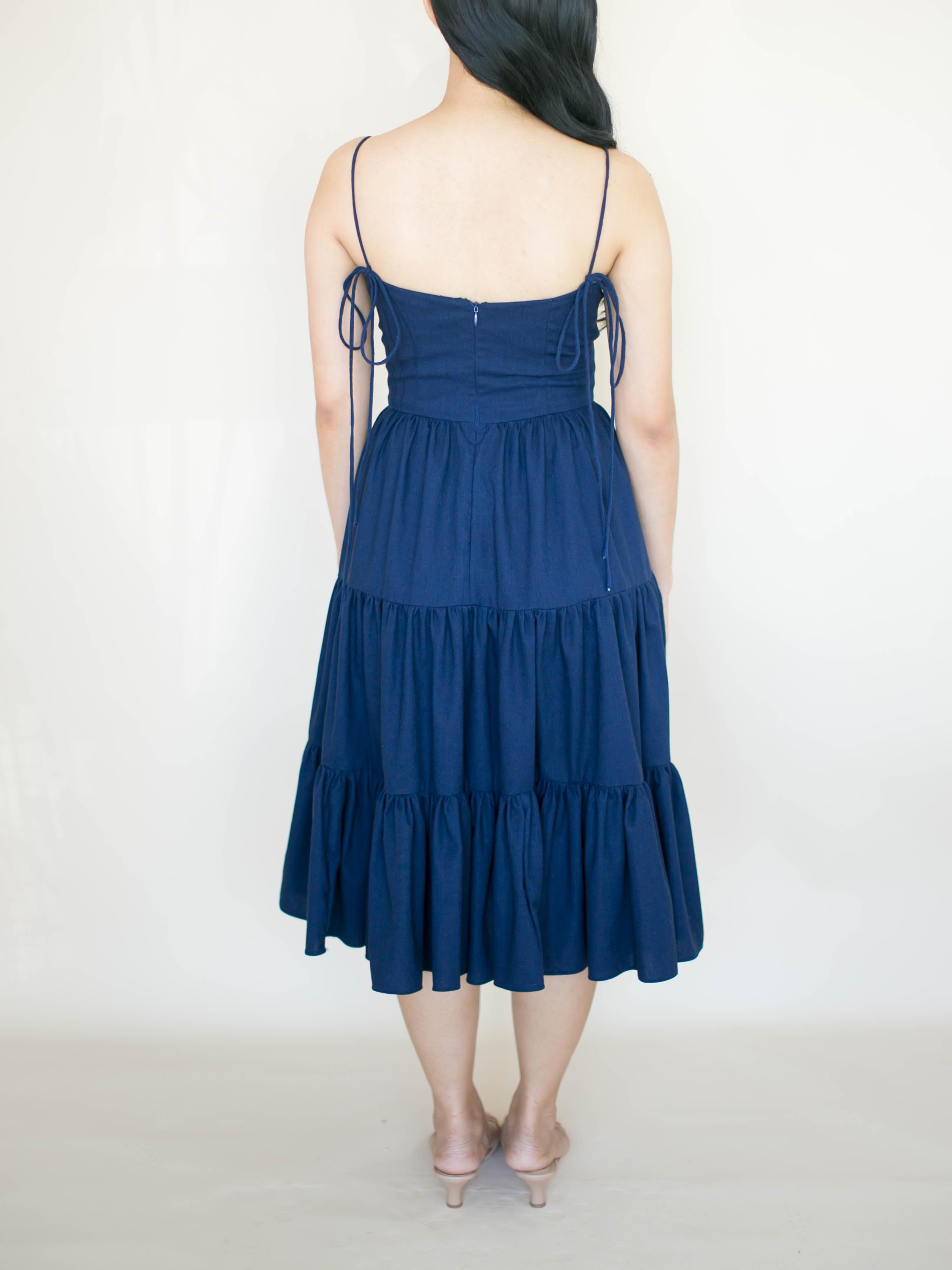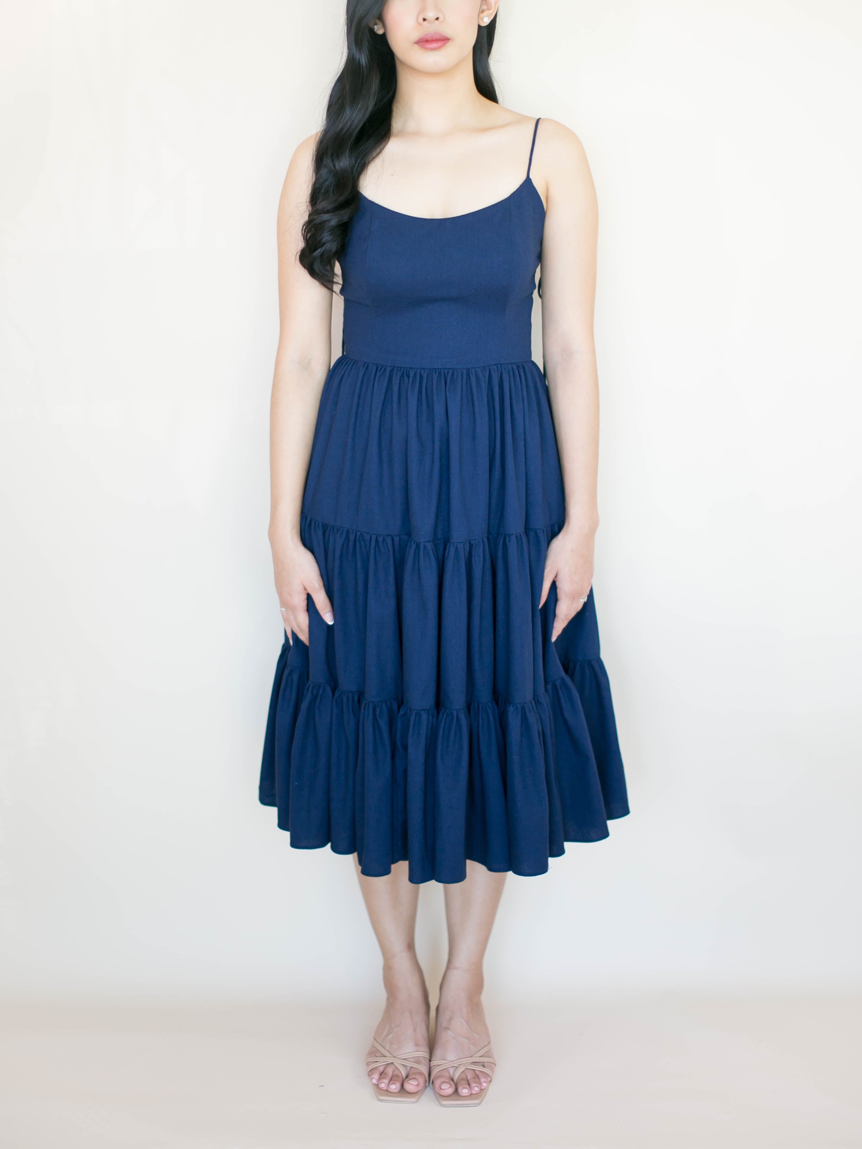 Three tiered midi dress with scoop neckline and shirred skirt. Designed with adjustble tie straps for a secured fit. Made with fully lined linen material and invisible zipper closure.