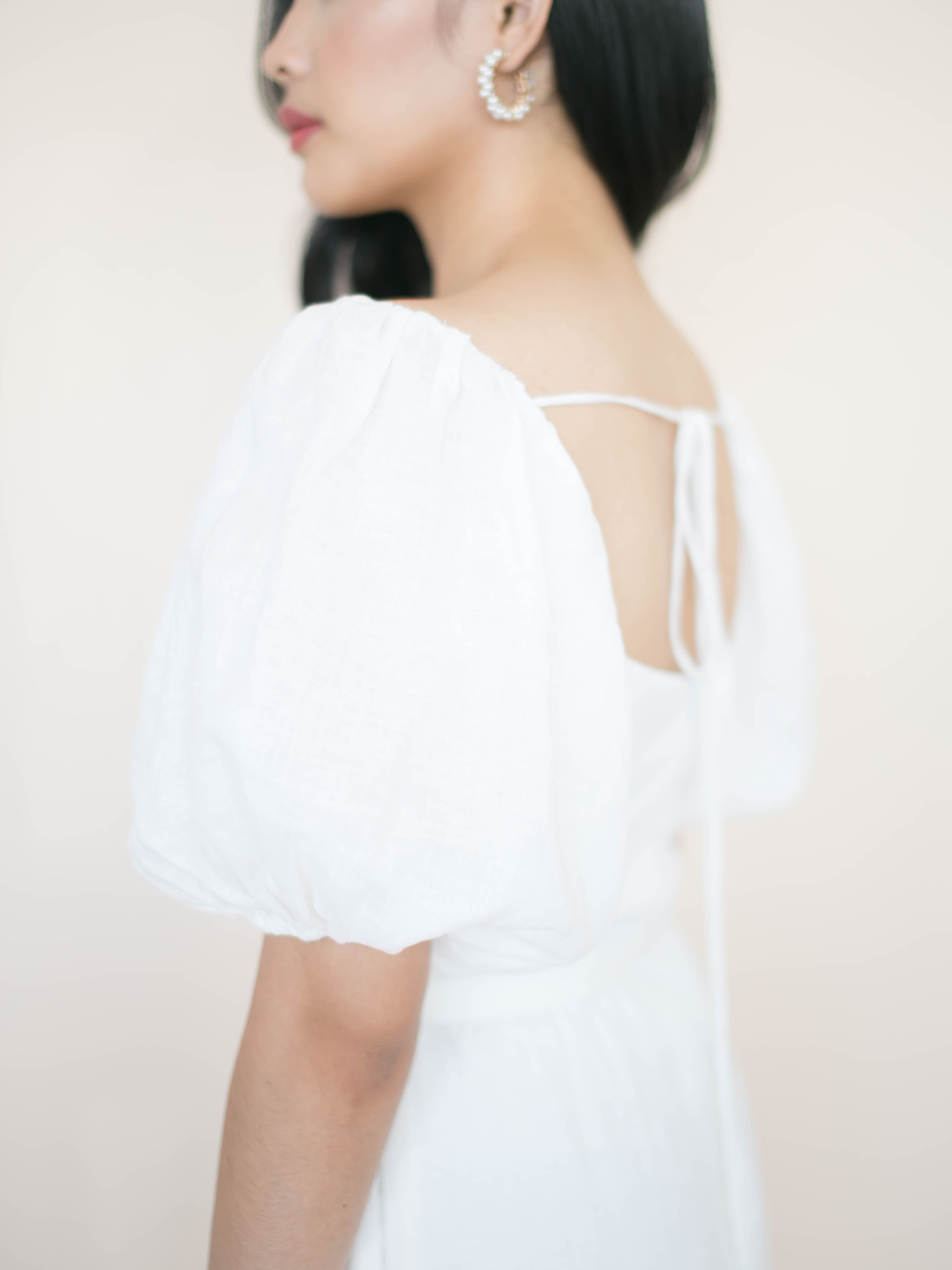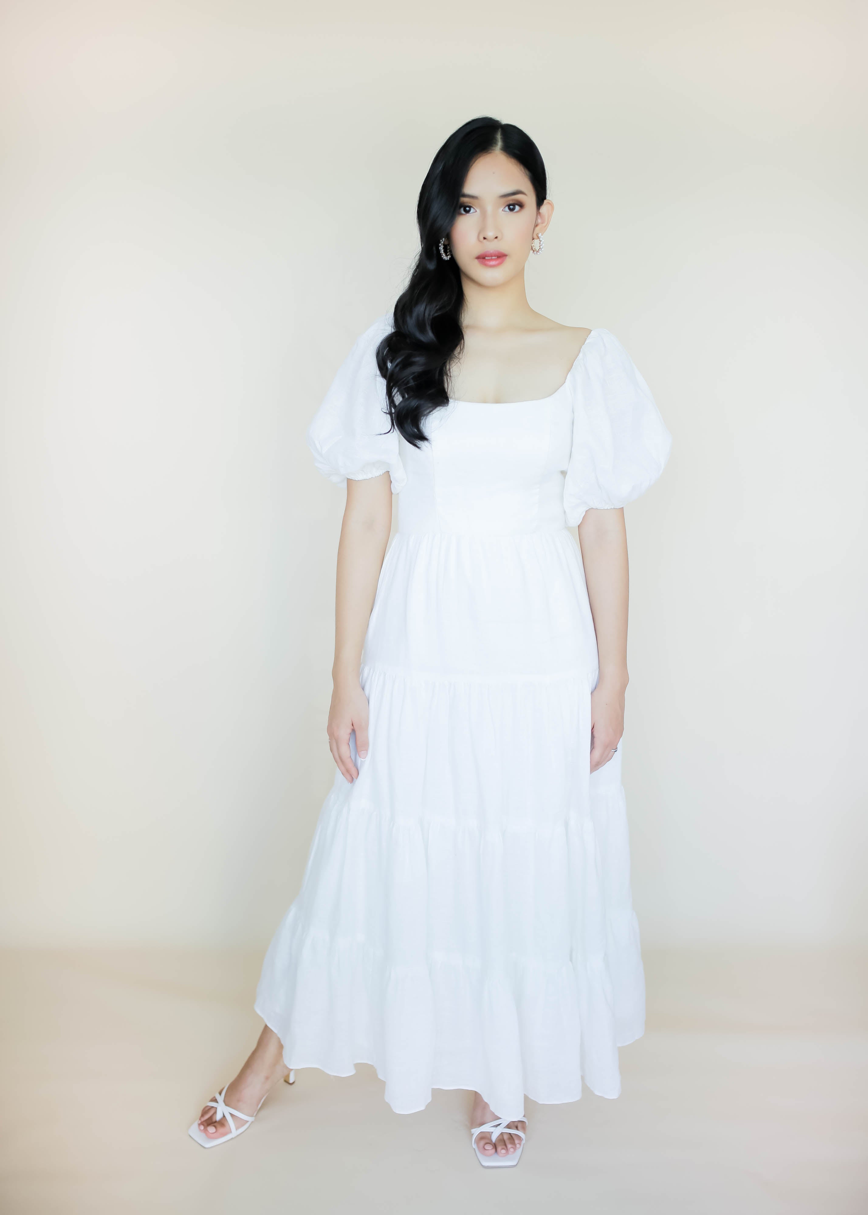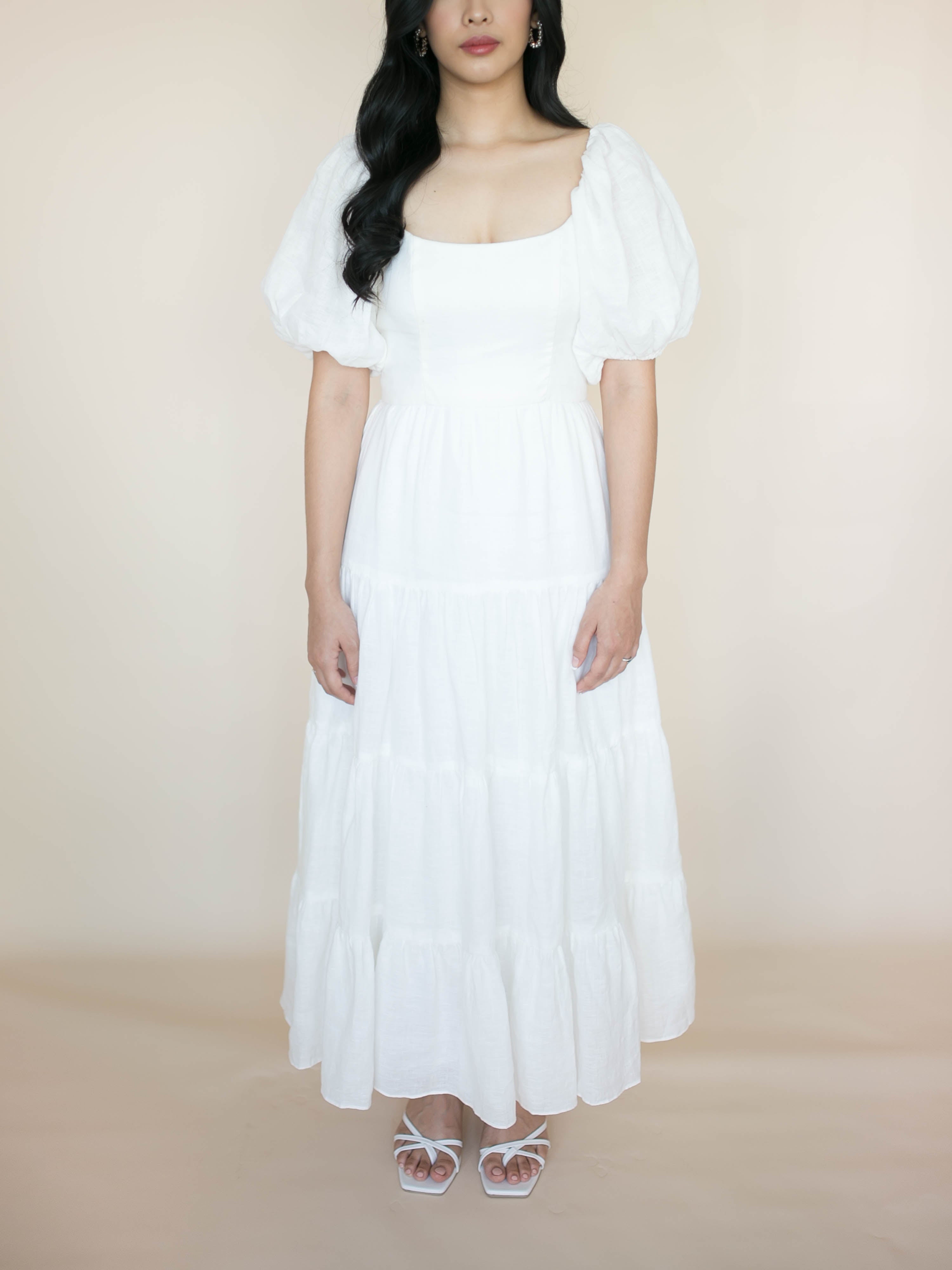 Three tiered long dress with scoop neckline and beautiful puff sleeves. Designed with pockets and ribbon details at the back for a secured fit. Made with fully lined linen material and invisible zipper closure.