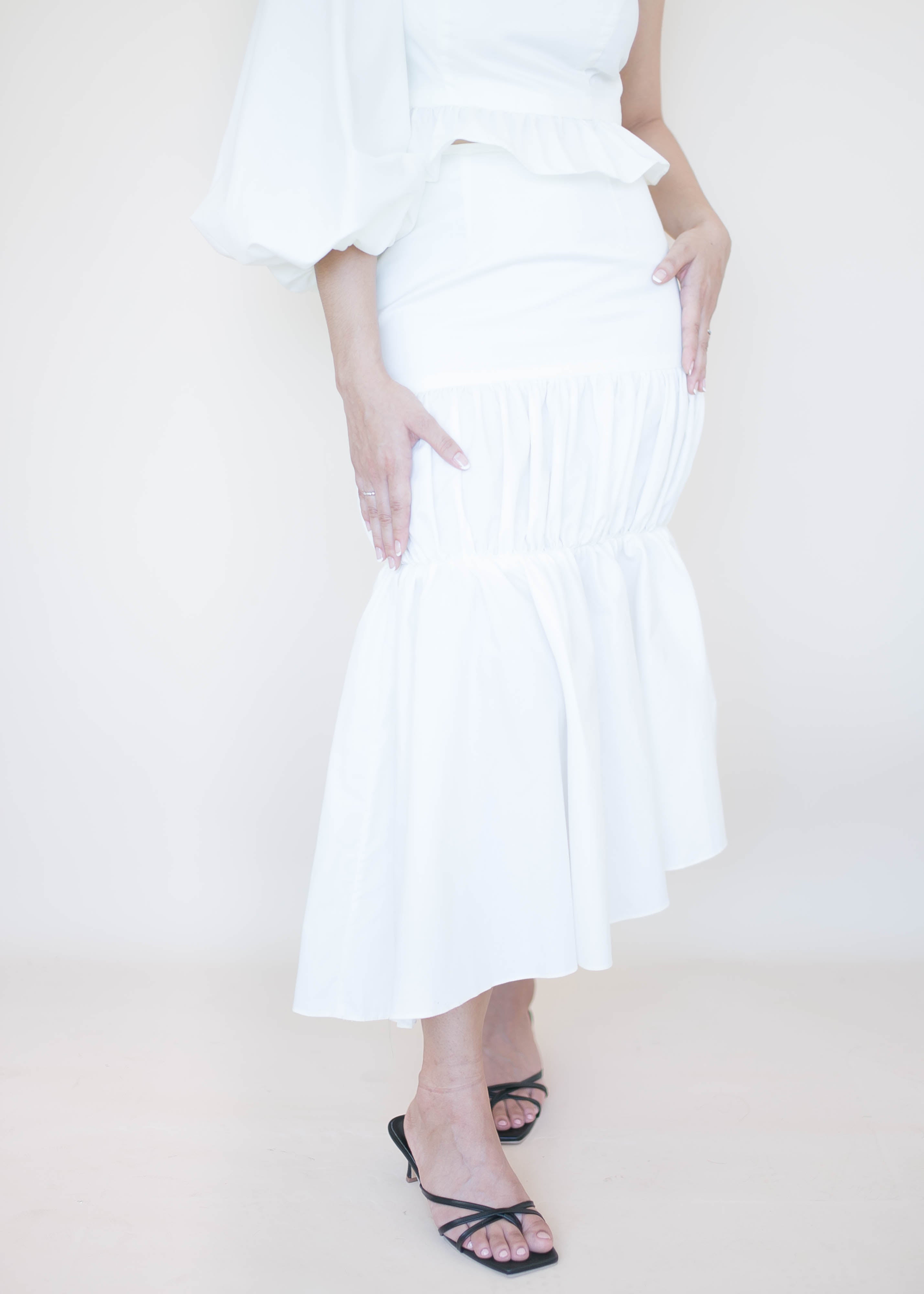 Beautifully shirred serpentina ruffled midi skirt that you can wear in any occasion. Made with cotton material and invisible zipper closure.
