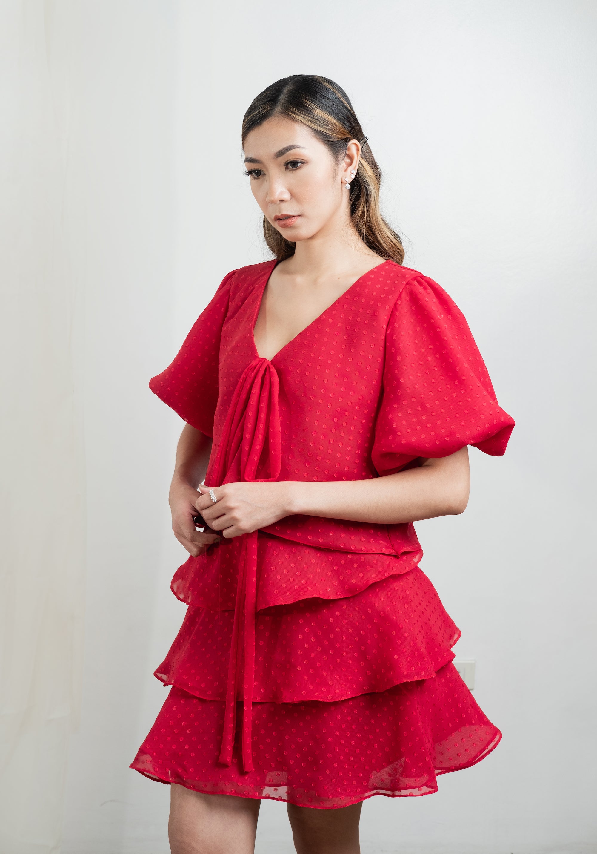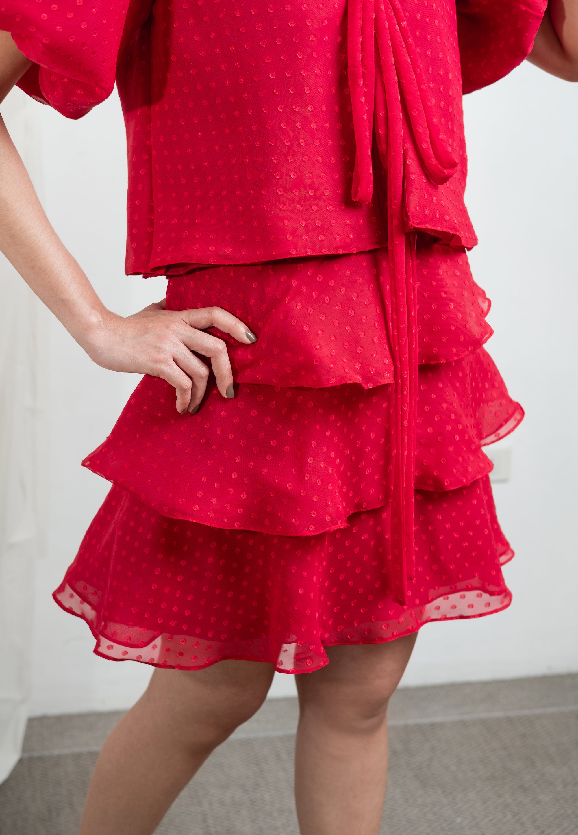Three layered mini skirt with invisible zipper closure. This skirt can be formal and playful at the same time. Perfect for any occasion. Made with fully lined jusi and chiffon material and comes in Black Polka as well. Best paired with our Eve top.